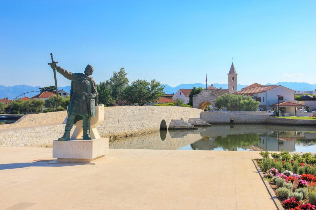 The historic old town of Nin is a small pearl in Croatia. It has been located on a tiny island since the 14th century, a promontory formed by sedimentation, and is connected to the mainland by two bridges. From the parking lot, a small pedestrian bridge directly leads to the historic town center. Right in front of it there is the monument of Knez Branimir of Nin, greeting visitors with his raised sword. Walking through the ancient alleys of the city, one discovers many things worth seeing and countless beautiful details to photograph.